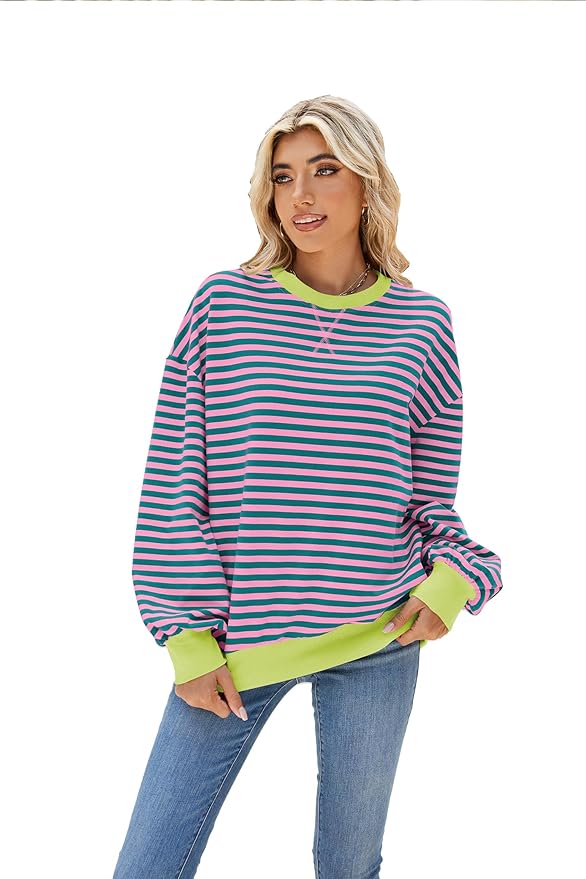 Women Sweatshirt Striped Long Sleeve Crew Neck Casual Loose Lightweight Comfy Pullover Shirt Tops