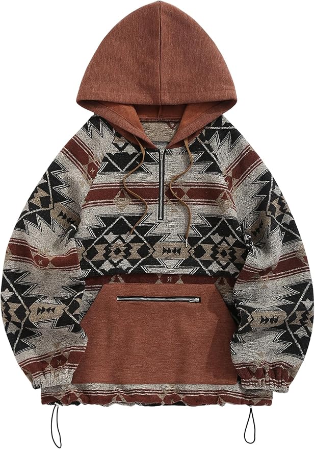 Men's Oversized Hoodie Quarter Zip Ethnic Aztec Print Loose Pullover Hooded Sweatshirt with Pocket